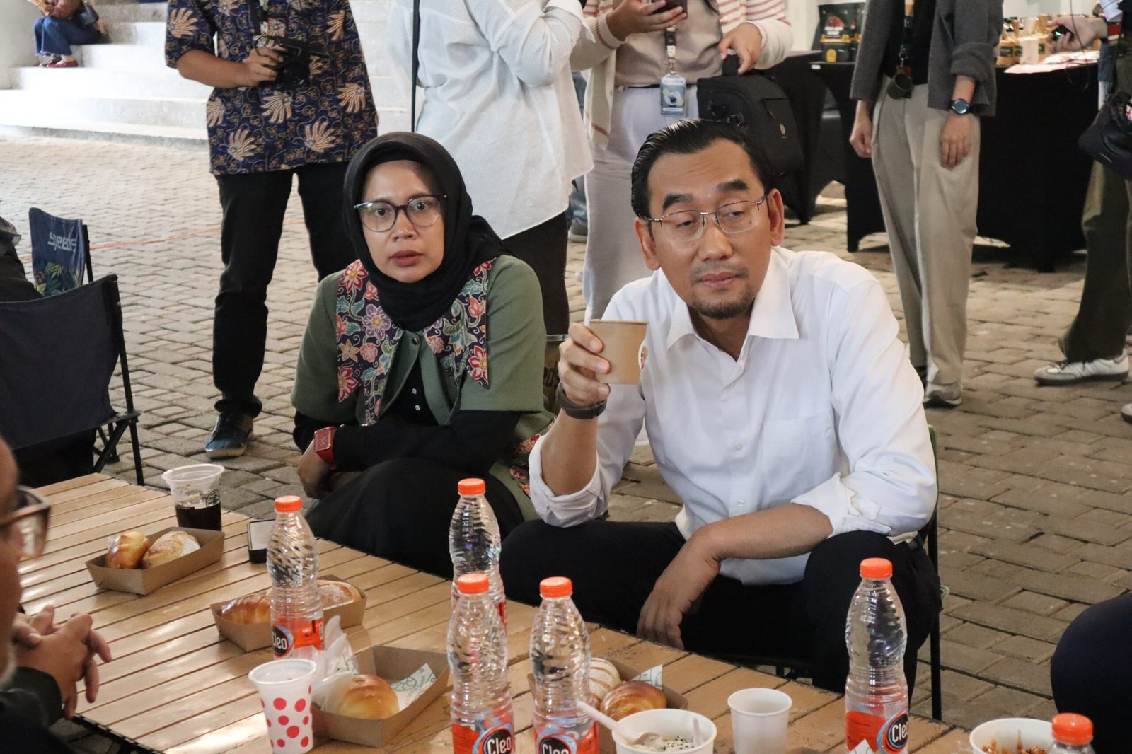 Rektor UB Prof Widodo dan Kepala BI Febrina menikmati Kopi di area Artcofest Audotorium Kampus setempat
